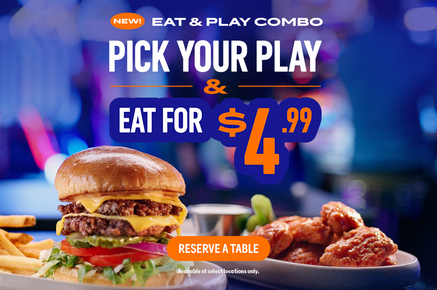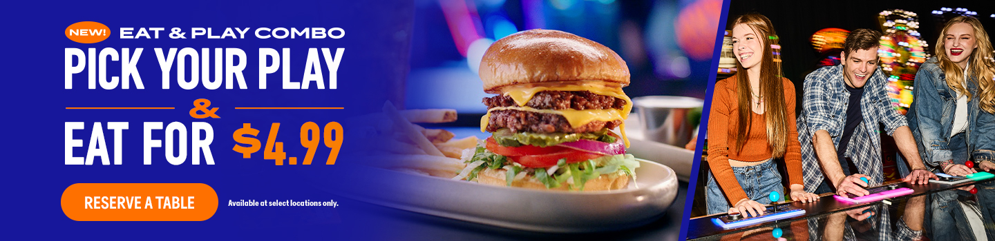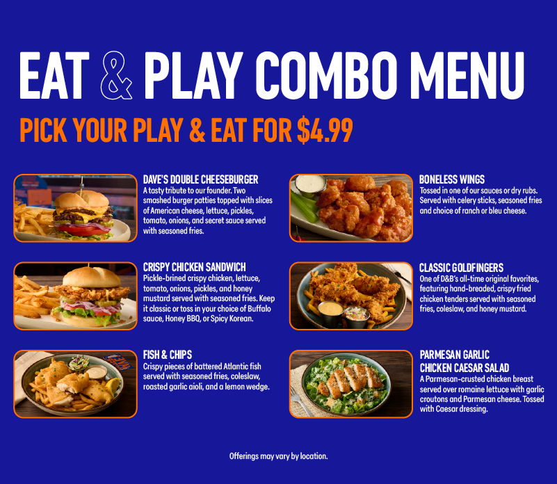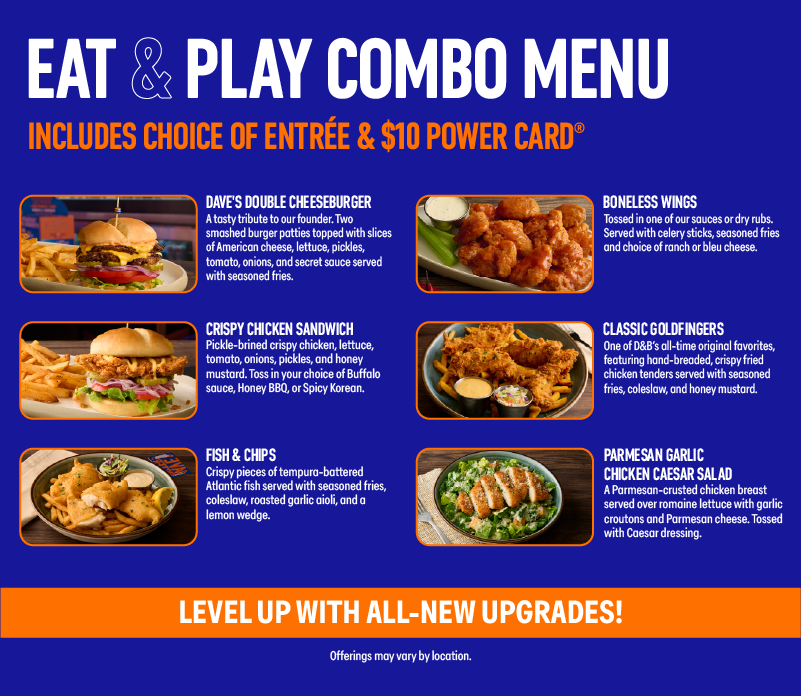 *EAT AND PLAY COMBO: Promotional. Eat & Play Combo. Limited Time only. Get a Dave’s Double Cheeseburger, Fish & Chips, Boneless Wings, Crispy Chicken Sandwich, Classic Goldfingers or Parmesan Garlic Chicken Caesar Salad plus a $10 Power Card. Promotional price starts at $19.99 per person but varies by location. Price may be subject to change at any time. Substitutions available for additional cost. Unlimited gameplay upgrade is valid from time of first gameplay swipe to store closure on the same day. Offer includes a 30-second lag between each gameplay swipe. Tickets earned on redemption games are capped at 1,500. Not valid on purple swipe games (VR, crane games, pushers, dance games or merchandising games) or orange/blue swipe amusements (Human Crane, the Arena, and Social Bays). Valid one per person. Tax and gratuity not included. Not valid with any other promotion. Dine-in only. Restrictions apply. See store for details. Void where prohibited.