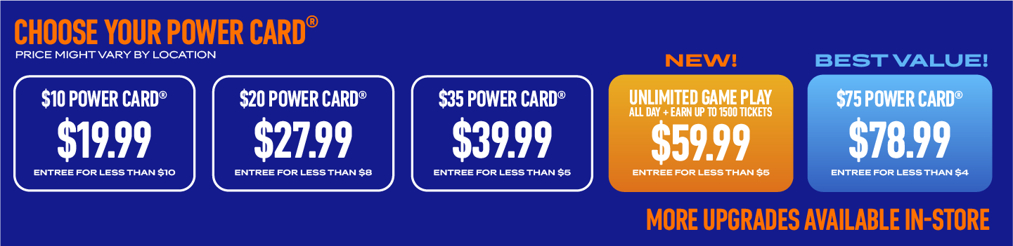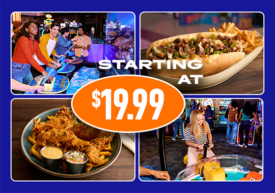 *EAT AND PLAY COMBO: Promotional. Eat & Play Combo. Limited Time only. Get a Dave’s Double Cheeseburger, Fish & Chips, Boneless Wings, Crispy Chicken Sandwich, Classic Goldfingers or Parmesan Garlic Chicken Caesar Salad plus a $10 Power Card. Promotional price starts at $19.99 per person but varies by location. Price may be subject to change at any time. Substitutions available for additional cost. Unlimited gameplay upgrade is valid from time of first gameplay swipe to store closure on the same day. Offer includes a 30-second lag between each gameplay swipe. Tickets earned on redemption games are capped at 1,500. Not valid on purple swipe games (VR, crane games, pushers, dance games or merchandising games) or orange/blue swipe amusements (Human Crane, the Arena, and Social Bays). Valid one per person. Tax and gratuity not included. Not valid with any other promotion. Dine-in only. Restrictions apply. See store for details. Void where prohibited.