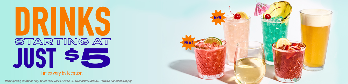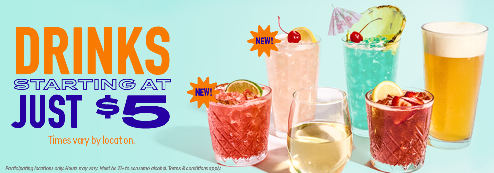 $5 Drinks Only: Promotional. Limited time only. Offer includes $5 22 oz. select domestic draft beer, $5 Lime Time Margarita and $5 Lime Time Frozen Margarita. Valid at participating locations only. Offer valid only on Sundays, Mondays, and Thursdays. Beer selection may vary by location. 16 oz. drafts in Canada locations. Hours may change by location. Offer may be revised or rescinded at any time. Not valid with any other promotion. Must be at least 21 years old to consume alcohol. Please drink responsibly. Other restrictions may apply. See stores for details. Void where prohibited.