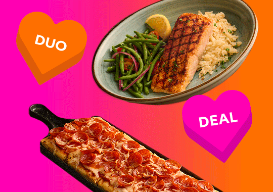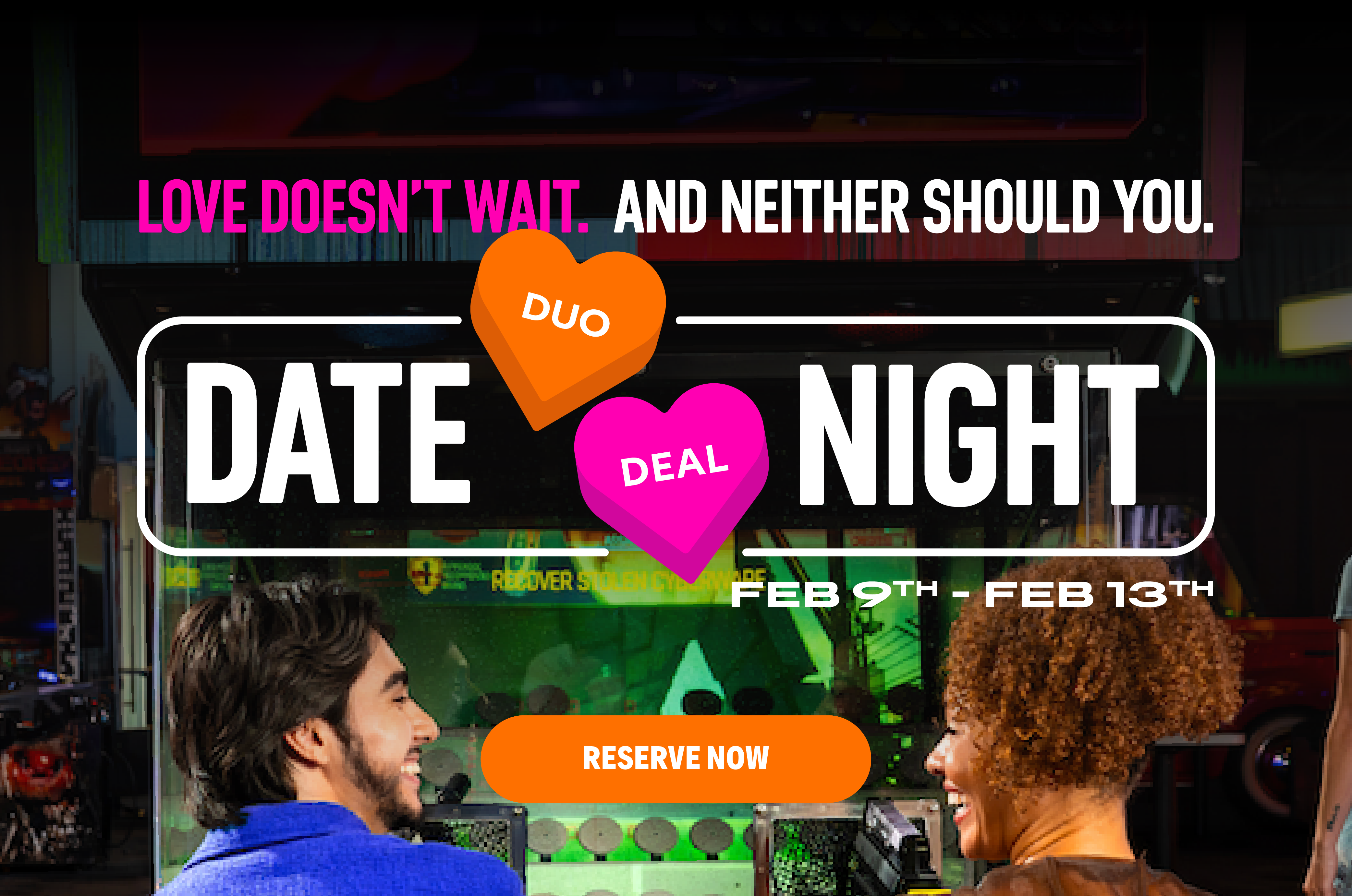 *DATE NIGHT DUO: PROMOTIONAL. Limited time only. Offer valid 2/9/26-2/13/26 only. Offer includes two (2) All You Can Play passes for ninety (90) minutes (with an ability to earn up to 1,500 tickets), any one (1) appetizer, any two (2) entrees and any one (1) dessert, starting at $99. Menu item exclusions may apply. Dishes may not be substituted or modified. Time begins upon first game play. Human crane and VR games not included. Offer must be pre-purchased through OpenTable. Offer not available to walk in guests. Price or offer may be subject to revision or recission at any time. Prices may vary by location. Tax and gratuity not included. Valid at participating locations only. Not valid with any other promotion. Dine in only. Other restrictions may apply. See store for details. Void were prohibited.