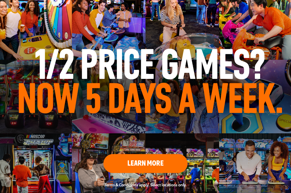 *1/2 Price Games: Promotional. Limited Time Only. Half Price Games. Offer valid only Sunday through Thursday. Not valid on Virtual Reality or Human Crane games. Excludes photo booths. Offer not valid after 10:00 pm in Hawaii. Power Card activation fee may apply. Offer cannot be combined with other promotions. Offer valid in-store only. Availability limited to participating locations only. Additional restrictions may apply. Offer subject to change or cancellation at any time. Void where prohibited. See store for details. Not valid at these locations: Bellevue, WA, Auburn, WA, Lynwood, WA, Edina, MN, Maple Grove, MN, Green Bay, WI, Manchester, CT, Myrtle Beach, FL, Corpus Christi, TX, Ft. Myers, FL.
