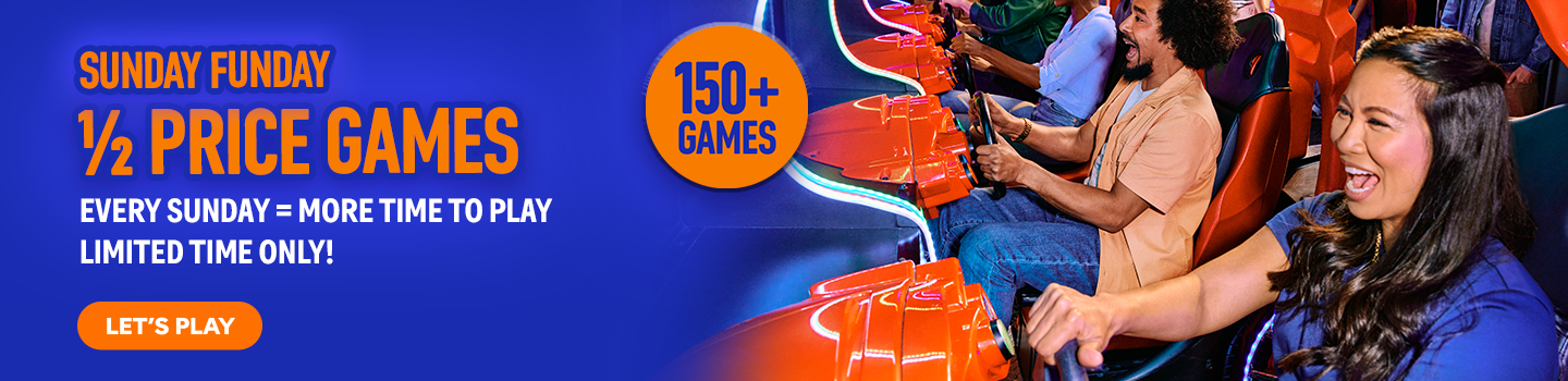 *5 Free Games Promotion not available at these Select Locations: Birmingham, AL • Barboursville, WV • Fort Meyers, FL • Gainesville, FL • Kentwood, MI • Greenville, SC • Sevierville, TN • Madison, WI • Memphis, TN • Myrtle Beach, SC • New Orleans, LA • Panama City, FL • Sioux Falls, SD • Albuquerque, NM • Salt Lake City, UT • Syracuse, NY • Oakville, ON • Vaughan, ON •  Lombard, IL