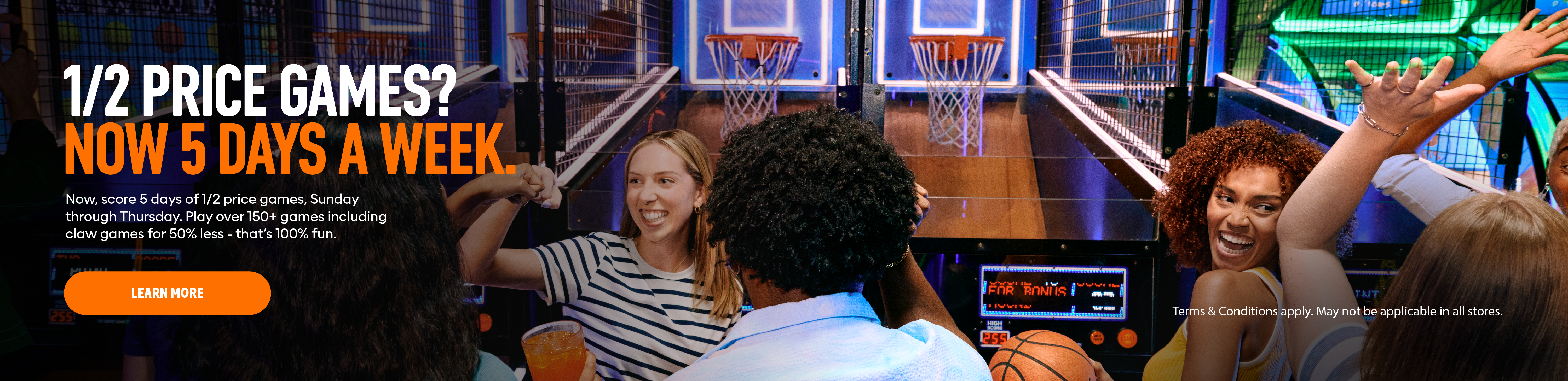 *1/2 Price Games Sunday: Promotional. Limited Time Only. Half Price Games. Offer valid in-store only. Valid only on Sundays through Thursdays for a limited time. In Atlanta, Lawrenceville, Wauwatosa, Manchester, Alpharetta, Auburn, Madison, Milford, McDonough, Bellevue, Lynnwood, and Green Bay locations, Half Price Games are valid every day for a limited time. Not valid on Virtual Reality or Human Crane games. Excludes photo booths. Game Play coupons may not be valid in combination with the Half Price Games offer on select days. Power Card activation fee may apply. Offer cannot be combined with other promotions. Additional restrictions may apply. Offer subject to change or cancellation at any time. Void where prohibited. See store for details. May not be applicable in all stores.