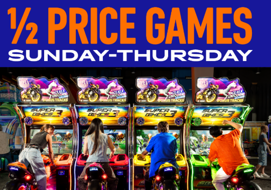*Half Price Games Sunday through Thursday: Promotional. Limited Time Only. Half Price Games. Offer valid in-store only. Valid only on Sundays through Thursdays. Not valid on Virtual Reality or Human Crane games. Excludes photo booths. In select locations only, offer not valid on purple swipe games (crane games, pushers, dance games or merchandising games). Game Play coupons may not be valid in combination with the Half Price Games offer on select days. Power Card activation fee may apply. Offer cannot be combined with other promotions. Additional restrictions may apply. Offer subject to change or cancellation at any time. Void where prohibited. See store for details.