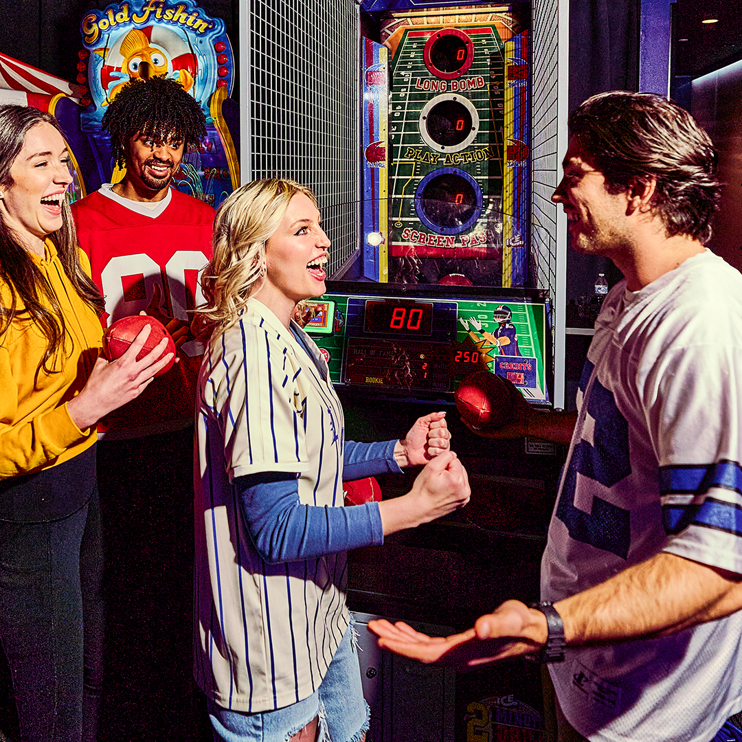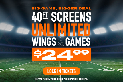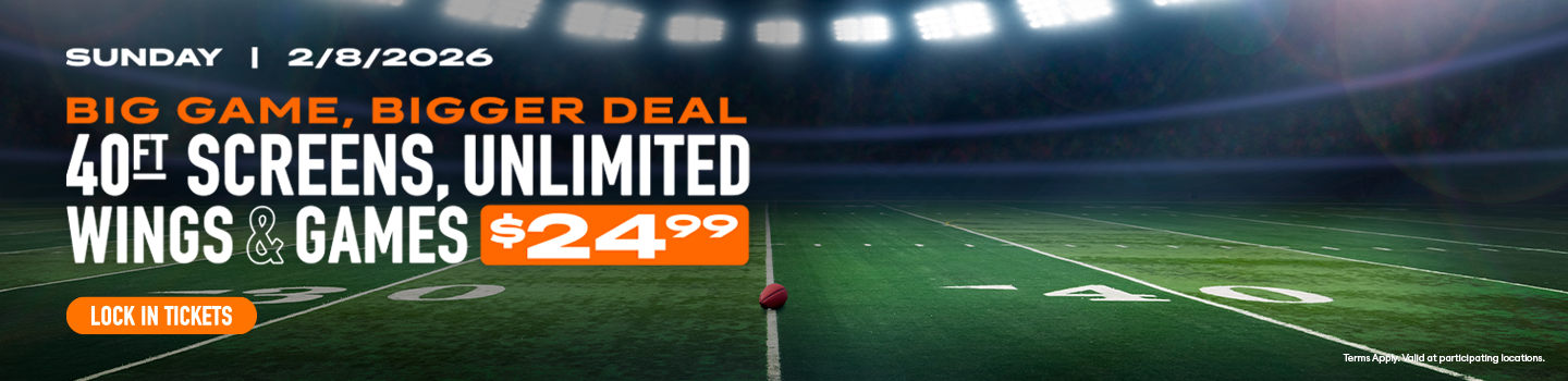 +BIG Game Experience: PROMOTIONAL. Limited time only. Big Game Ticketed Experience. Offer valid 2/8/26 only. Starting at $24.99, receive premium seating access, All You Can Eat Wings until the final whistle of game, and unlimited game play all day. Tickets must be purchased in advance through FEVER up until 2:00 p.m. eastern/1 p.m. central/11a.m. pacific on 2/8/26. All You Can Eat Wings valid one per person, per seating, on premise. Get traditional and boneless wings with Classic Buffalo, Honey BBQ, or No Sauce. First individual order includes 6 traditional or boneless wings and side of ranch. Reorders include 6 traditional or boneless wings. One choice of sauce per order. Cannot mix traditional and boneless in the same order. No take home bags. Participants eligible for various in select game live moments and surprise activations, to be determined by store. Offer not available for walk-in guests. Not to be combined with other offers. Available in store only. Dine in only. Excludes human crane, VR and redemption games. Promotion may be subject to revision or rescission at any time. Prices may vary by location. Tax and gratuity not included. Subject to availability. Valid at participating locations only. Store participation may vary. Not available with any other promotion. Not available in Honolulu/Ala Moana, Bayamón, Bellevue, Cary, Jacksonville, Los Angeles/Hollywood, San Antonio/Crossroads or San Juan locations. Other restrictions may apply. Void where prohibited. See store for details.